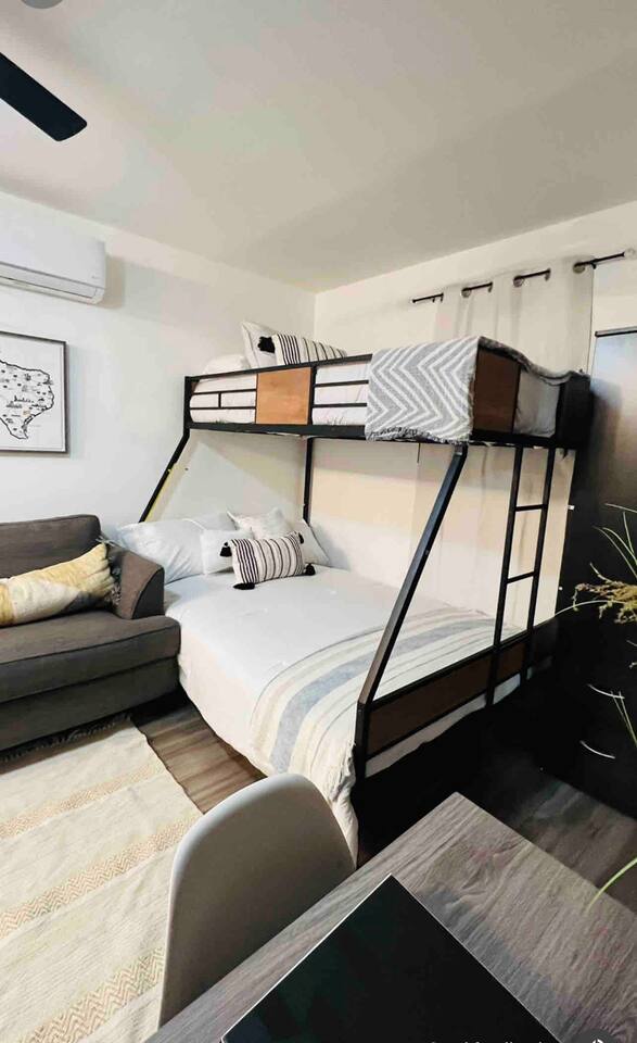 ⭑Bedroom:⭑ ✔ Cozy double bed perfect for a restful night's sleep ✔ Additional single bed for added sleeping space ✔ Bunk bed ideal for children or extra guests ✔ Crib available for families traveling with a baby ✔ Ample storage space for your belongings ⭑Living Area:⭑ ✔ Modern layout with a comfortable seating area ✔ Smart TV for your entertainment needs ✔ Fast Wi-Fi to keep you connected ⭑Kitchenette:⭑ ✔ Fully equipped with all the essentials for your cooking needs ✔ Compact fridge, microwave, and stove ✔ Coffee maker to start your day right ✔ Dining area with seating for two ⭑Bathroom:⭑ ✔ Full bathroom with a shower and fresh towels ✔ Essential toiletries provided for your convenience ⭑Additional Amenities:⭑ ✔ Washer and dryer in-unit for your laundry needs ✔ Iron and ironing board available ✔ Central heating and cooling to keep you comfortable year-round ⭑Outdoor Space:⭑ ✔ Private outdoor area where you can relax and unwind ✔ Parking space available for your vehicle Your stay at this modern studio promises easy comfort, perfect convenience, and a cozy experience. Book now and explore the area in style! ⭑Conclusion⭑ This studio is ideal for travelers looking for a strategically located and well-equipped space. Whether you're visiting for business or leisure, you’ll find everything you need for a comfortable stay. Don't miss out—book your stay today!